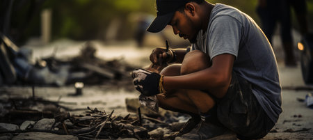 A detailed scene of individuals diligently removing litter from a beach, focusing on the close up view of their dedicated efforts.