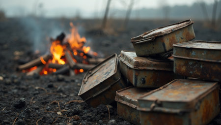 Abandoned rationale tins by a campfire on a desolate battlefield