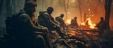 Soldier, team, and group in the jungle, smoke, or conflict zone,
