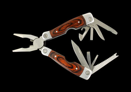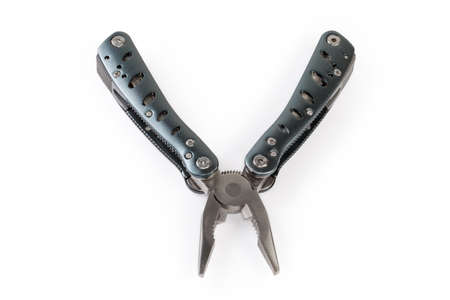 Multitool is a multi-functional tool on a black background. The concept of an expanded multi-tool with free space. Clipping path included isolate