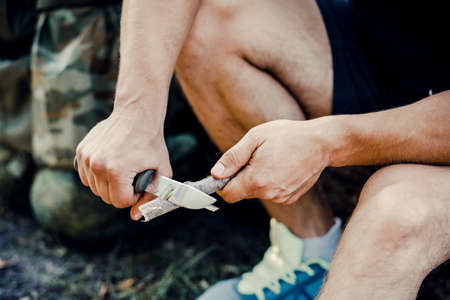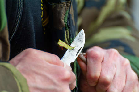 A man with a knife cut a wooden stick for a fire in the woods. The concept of tourism, hunting and people