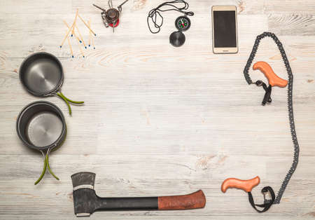 Hiking equipment: compass, phone, tent, ax, gas, burner, matches and other set on wooden background, top view