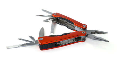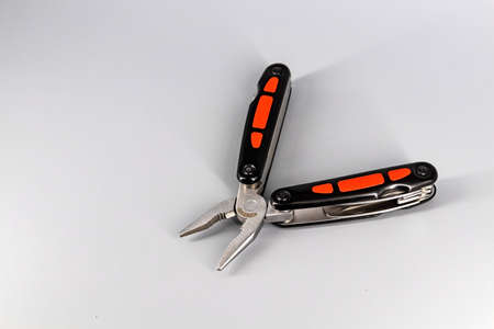 Pliers isolated on white background, Metal plier with red rubber handles , Multi tool folding knife with several accessories for general use.