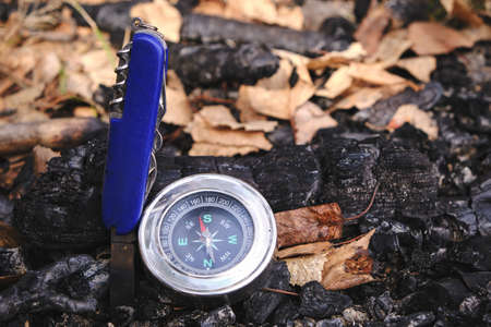 Penknife and a compass on the coals an extinguished campfire, picnic, recreation and adventures in the wild