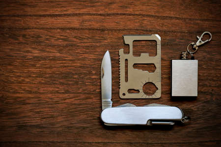 Compass, survival knife and lighter on ground in forest.Survival tool.