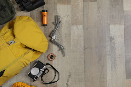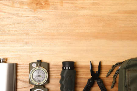 Flat lay composition with different camping equipment on wooden background, space for text. Traveler set