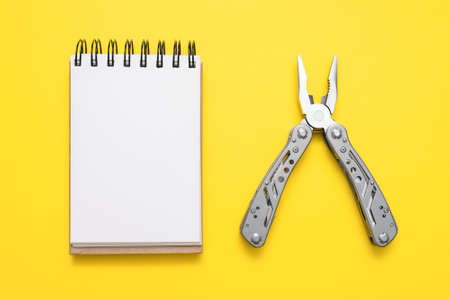 Blank paper page notepad and steel multi tool on the yellow flat lay background.