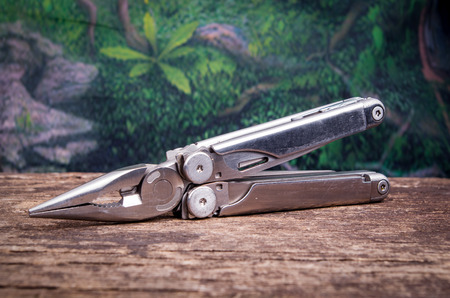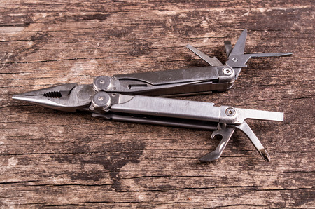 Simple pliers and multitool on wooden surface. Improved construction tools. Everyday instruments and tools. Progress. Construction and Repair.