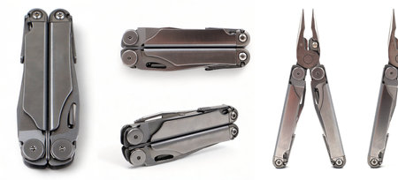 Modern steel multitool with many tools isolated on a white background. Set of different angles and positions. Portable multitasking tool. Compact and portable product. EDC concept