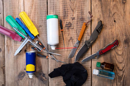A variety of tools and knives. Several sharpened knives. Sharpening and cleaning knives.