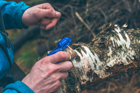 extreme conditions. hike and camping life. tourist man striking fire with the flint and steel