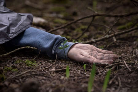 A dead mans hand on the ground in the woods. Murdered man