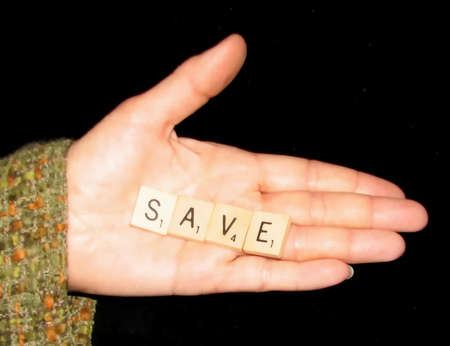 A word Save written on the wood cubes. Save lettering made of wooden cubes isolated on white