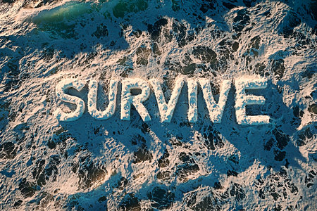 AI Generated - Word survive written in the ocean, with the water lapping against the shore and the sun shining brightly in the background. Commercial illustration artwork for business applications.