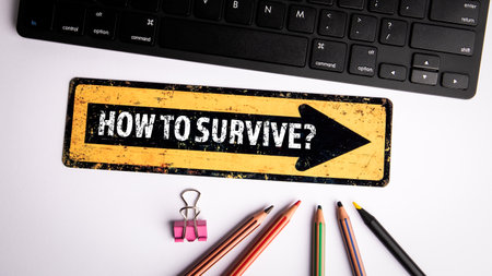 How to survive. Pointing arrow with text, computer keyboard on white office table
