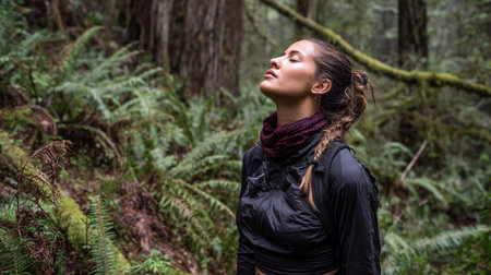 Person takes a deep breath in the forest while hiking surrounded by green trees and plants.