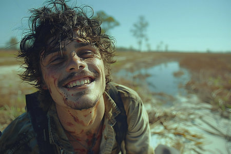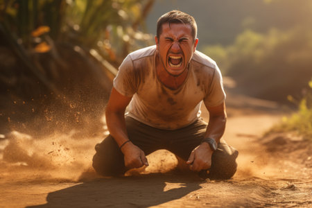 A young man shows intense emotion as he crawls on the dry ground under bright sunlight, radiating enthusiasm.