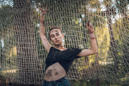 portrait of a young girl in torn clothes holding a knife or machete and posing in the woods