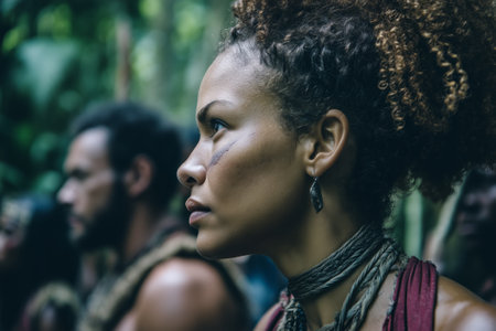 A beautiful woman from an isolated island tribe standing in a dense jungle, with other members of her tribe visible in the background. AI-generated item