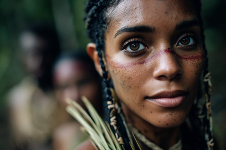 Portrait of a beautiful woman from an isolated island tribe standing in a dense jungle, with other members of her tribe visible in the background. AI-generated item