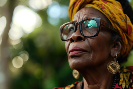 Close-up of a thoughtful senior woman wearing glasses and traditional headwrap, with natures bokeh in the background