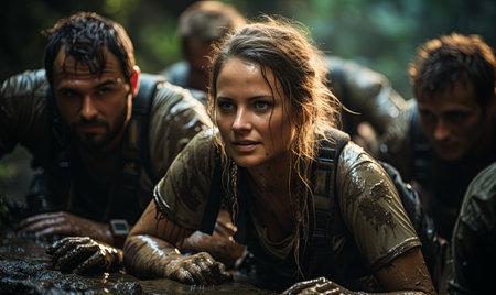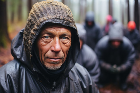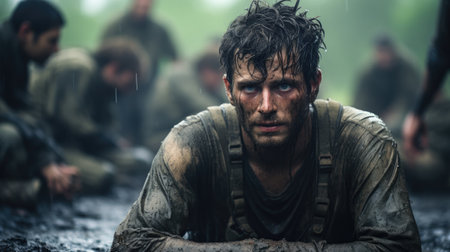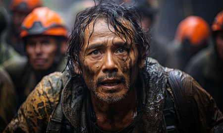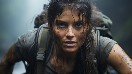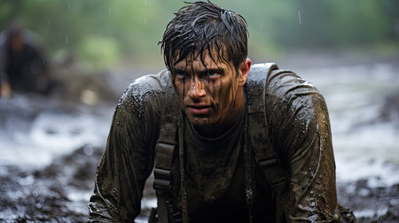 Close-up of a determined rescue medic with muddy face during an emergency operation in a forest.