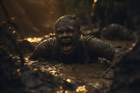 A participant pushes through a mud challenge, showing resilience and energy.