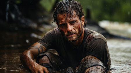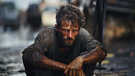 Man with dirty face and hands in the rain sit in mud.