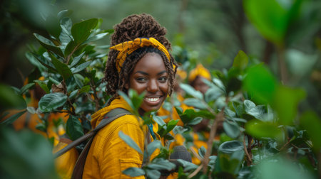 Cheerful African woman in yellow jacket, planting trees in a forest with a group of volunteers, promoting environmental conservation.