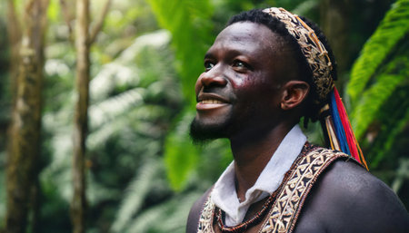 Portrait of a young African man with traditional clothes in the jungle