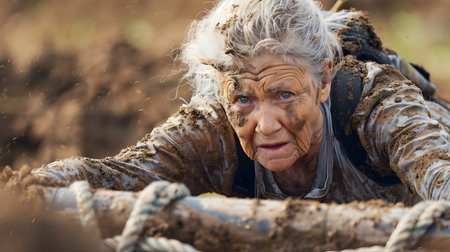 An elderly woman with a weathered and determined expression on her face is shown participating in an extreme obstacle course race Her clothing and body are covered in mud indicating the challenging