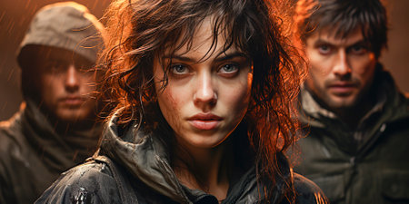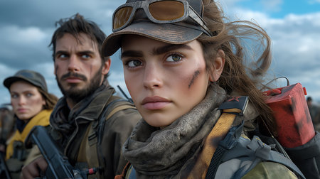 Serious young adults with tough expressions standing together outdoors as a rebellious group.