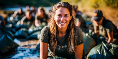 Environmental volunteers to gather up trash on the beach. Activists work together to protect the environment and reduce ocean pollution. Focus on protecting the environment