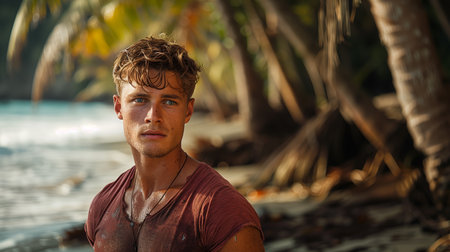 Young Man Stands Thoughtfully on Tropical Beach With Palm Trees Nearby at Sunset