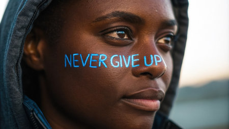 Portrait of Hope A closeup of a person with warm brown skin their eyes reflecting determination. The words Never Give Up illuminate their cheek in bright blue neon casting a soft.