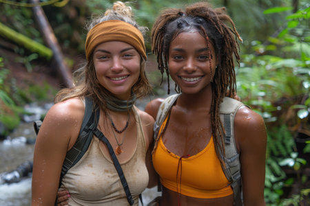 lesbian couple hiking together bokeh style background