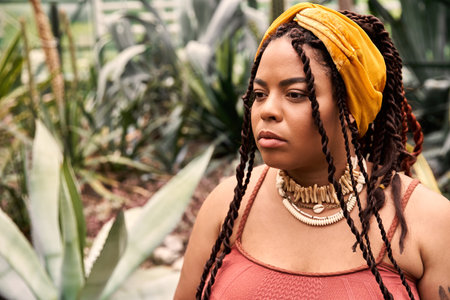 A serene moment as a confident black woman admires the greenery around her in a lovely dress.