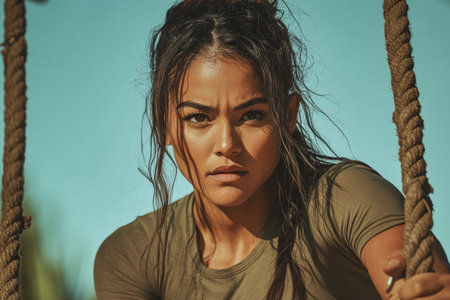 Determined Young Woman Engaged in Outdoor Fitness Activity with Ropes.