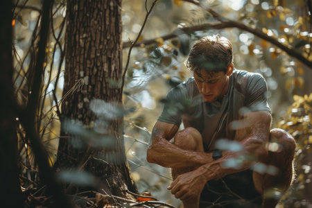 A man is sitting in the woods, looking at the camera. He is wearing a shirt and shorts and he is sweating. Scene is somewhat somber, as the man seems to be lost in thought