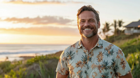 A man stands on a coastal path with a sunset backdrop, wearing a floral shirt. He smiles at the camera, surrounded by lush greenery and ocean waves.