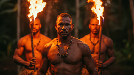 This striking image showcases a group of strong warriors in a jungle setting, holding torches and embodying the spirit of adventure and tradition.