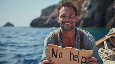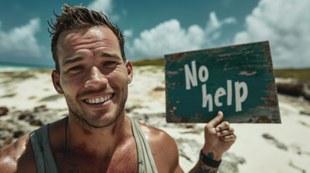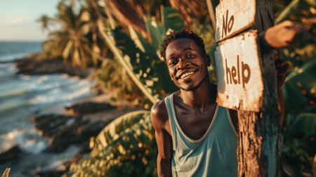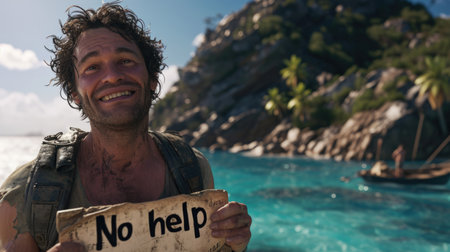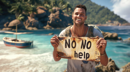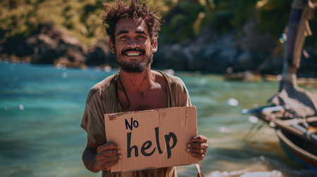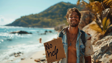Embrace of carefree living: a persona on a deserted island, holding a sign proclaiming well-being, a tranquil portrayal of solitude, joy, and contentment in the simplicity of a remote paradise