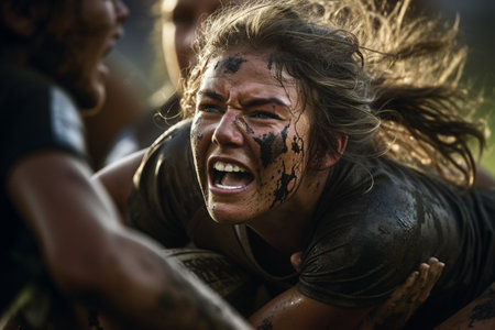 Female rugby players competing on the rugby field in the evening