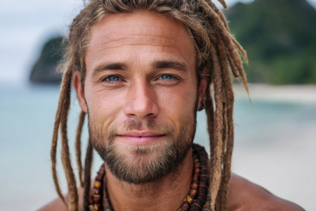 Man with blue eyes and beard posing on a white sand beach