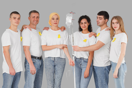 Mature woman and people with yellow awareness ribbons undergoing chemical therapy course on light background. World Cancer Day