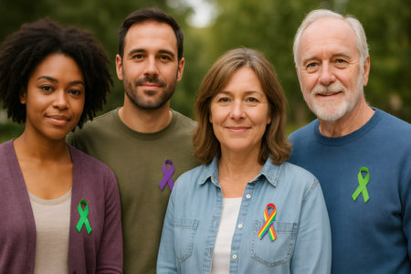 Group of activists wearing different colored awareness ribbons pinned to their shirts, demonstrating their support for various social causes