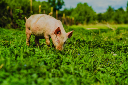 Happy Pig Exploring a Green Pasture Under Bright Daylight With Trees in the Background