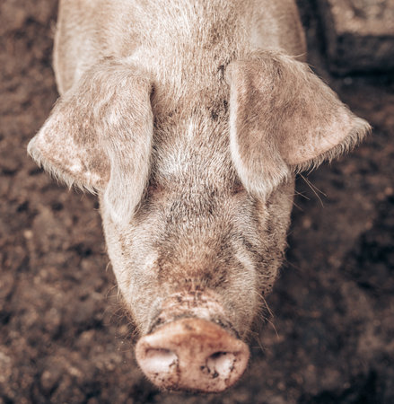 Happy pig with dirty snout poses for the camera. Domestic animals farming.