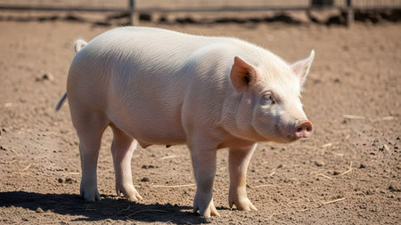 A clean, young pink pig stands in a dirt pen on a sunny day. The side profile of the farm animal highlights its healthy condition, set against a blurred rural background typical of livestock farming.
