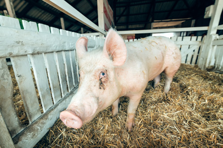 Portrait of a cute pig on a farm. Selective focus.